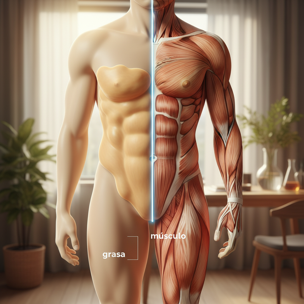Una báscula común no distingue. Utilice un impedanciómetro, mediciones de fuerza (fuerza de agarre) o mediciones antropométricas (circunferencia del brazo, circunferencia del muslo). Un escáner DEXA proporciona la medición más precisa.